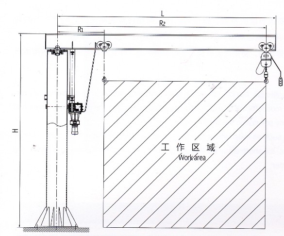 定柱式旋臂起重機(jī)由立柱裝置、回轉(zhuǎn)裝置、旋臂裝置及環(huán)鏈電動(dòng)葫蘆等組成,主要包括 上立柱、下立柱、主梁、主梁拉桿、起升機(jī)構(gòu)(環(huán)鏈電動(dòng)葫蘆)、回轉(zhuǎn)機(jī)構(gòu)、電氣系統(tǒng)、爬梯及檢修平臺(tái)。立柱下端固定于混泥土基礎(chǔ)上,旋臂回轉(zhuǎn),可根據(jù)用戶(hù)需求進(jìn)行回轉(zhuǎn)。回轉(zhuǎn)部分分為手動(dòng)回轉(zhuǎn)和電動(dòng)回轉(zhuǎn)。環(huán)鏈電動(dòng)葫蘆安裝在旋臂軌道上,用于起吊重物。
